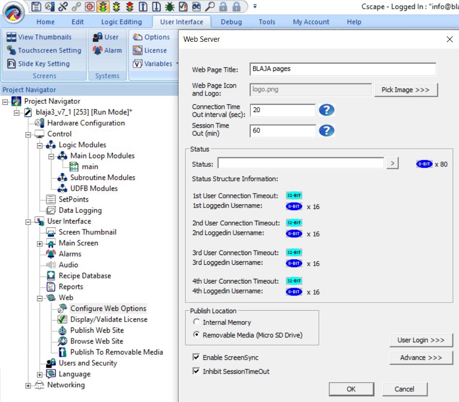 Jdeme na nastavení webserveru. Na rozdíl od minula jsme tady vyzkoušeli i nahrání projektu na paměťovou kartu, kde potom můžete využívat všechny funkce přes Horner WebMI. Zatrhneme cíl RM, kde nahrajeme webové soubory. Ale ještě upravíme, další nastavení.