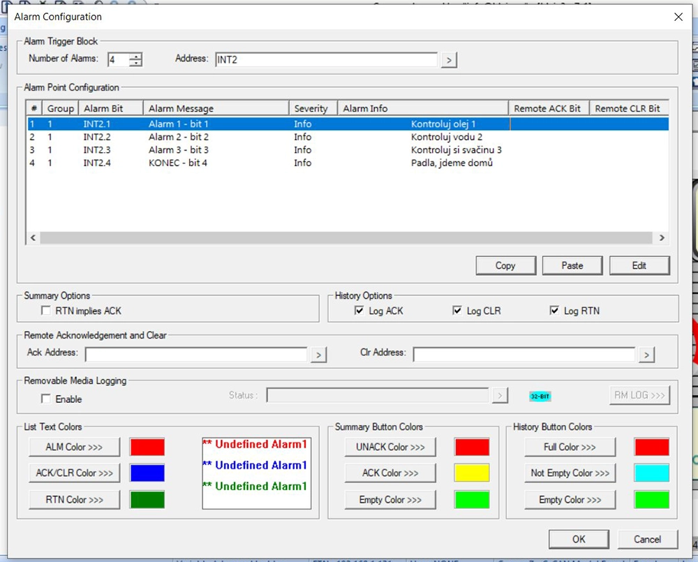 Na novou obrazovku jsme z Toolboxu šoupli objekt alarmů. Ty fungují následně, nahoře zadáme adresu 16bitové proměnné a pak je každý bit z toho slova jedno alarmové hlášení. Automaticky se přiřazuje dále a dále, jak je vidět na sloupci vlevo. Napíšeme si ke každému alarmu zprávu a poznámku. Plus další nastavení jako potvrzení alarmu nějakou proměnnou, logování, barevné kombinace a tak podobně.