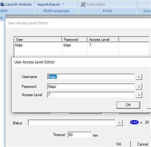 Uživatele s heslem definujeme v editoru uživatelů. Nechejte si tam ty čárky před jménem a za jménem, stejně jako u hesla. Jméno a heslo je také možné použít z proměnné v PLC.