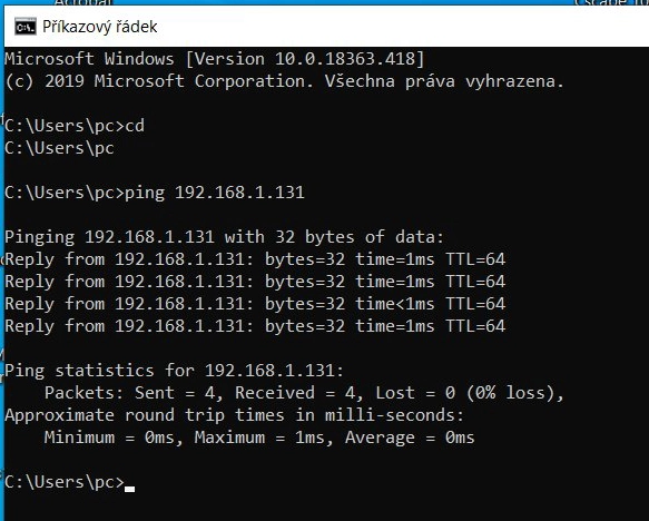 Ještě pro jistotu jeden ping, abychom zkontrolovali připojení PLC na síti.
