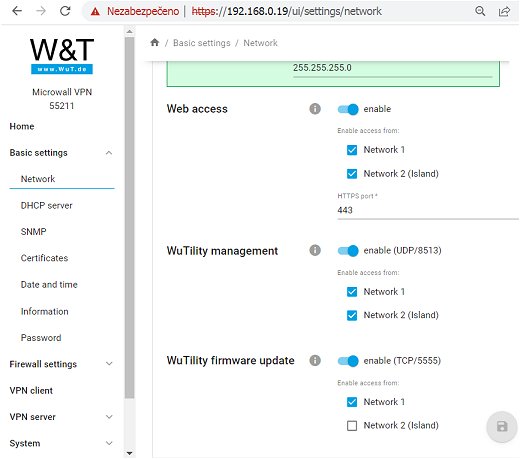 Povolení různých služeb, například přístup na webový server i z portu LAN, tedy ostrovní = „island" sítě.
