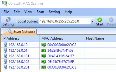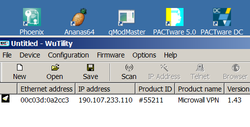 Pokud je vše v pořádku, vidíme na naší síti WAN port xx.0.19 - žlutý od Microwallu, x.0.51 je PC, x.0.102 je mobil a x.0.201 je IP, na kterou se budeme připojovat. Microwall zařídí, aby spojení z této IP adresy až na PLC do jiné sítě bylo průchodné.