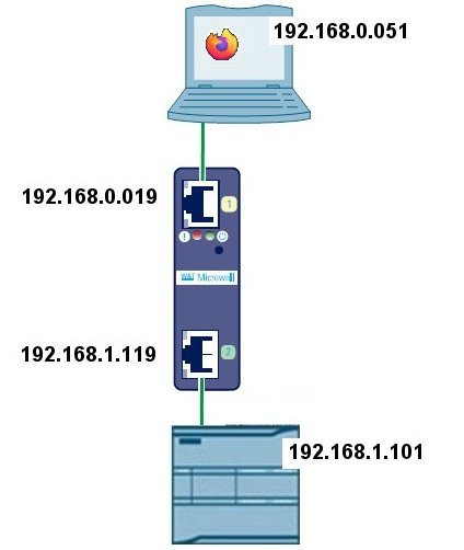 A tohle budeme od naší krabičky potřebovat. Jednoduché spojení dvou nezávislých sítí a přístup z PC v jedné síti do PLC v druhé síti.