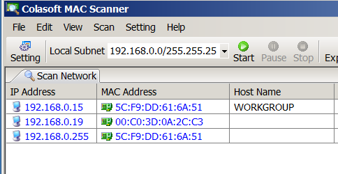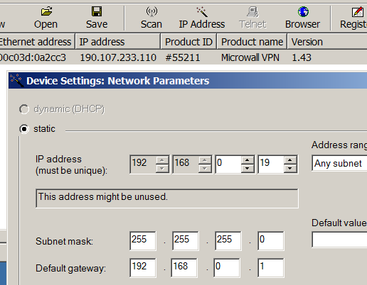 Překontrolujeme, zda je Microwall na síti vidět. Jedná se o port WAN, tedy žlutý, i když výrobce jej nazývá Network 1.