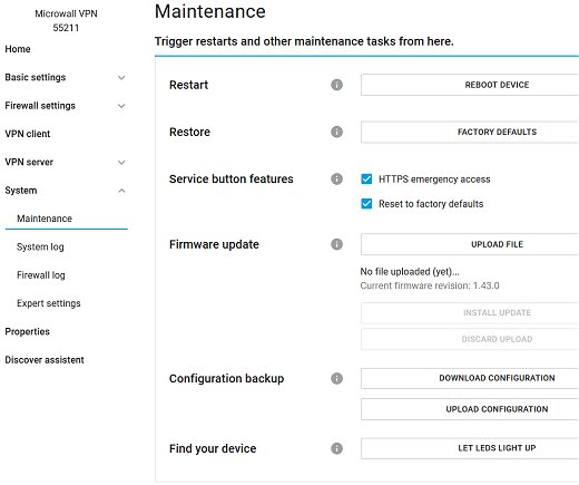 V sekci „údržba" se dá použít služba „najdi zařízení", která rozbliká LED na Microwallu, dále aktualizovat firmware a hlavně uložit (a obnovit) celé nastavení do souboru.