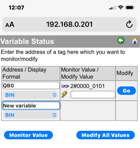 Z prohlížeče v mobilu se zase dostaneme do webového serveru PLC a vidíme online proměnné.