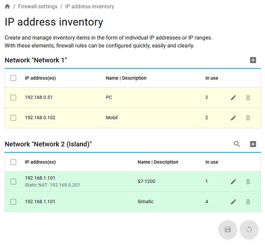 Inventář IP adres je bezva věc, kde si definujeme zařízení v obou sítích. Ve WAN, tedy vyšší, internetové, nadefinujeme jeden počítač a jeden mobil. V LAN, tedy třeba výrobní, zase jedno PLC. I když máme tyhle IP adresy 2x stejné, jednu jsme použili v nastavení NAT a druhou použijeme v definicích firewallu.
