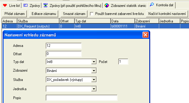 Záložka ProfiTrace a dole pak Kontrola dat, to je záložka s lupou. Tady můžeme vidět data, která se zapisují nebo čtou ze zvolené stanice. Přes tlačítko Přidat záznam si vyplníme v samostatném okně, co chceme vidět. Tady v příkladu se jedná o periferii ET200S osazenou modulem 4xDO a z PLC programu včechny 4 výstupy blikají 1 Hz.