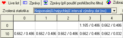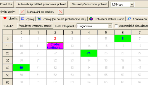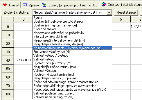 Stále jsme v záložce ProfiTrace, ale tentokrát máme Zobrazení statistik stanice. Velmi důležitá funkce. V rozbaleném menu jsou vidět všechny dostupné statistiky stanice. Ty si ihned po spuštění začíná ProfiTrace 2 zapisovat, aby byly kdykoliv dostupné uživateli. Hlavně se jedná o prvních pět poruchových statistik. Další mají více informativní charakter, můžete tady konkrétně vidět intervaly výměny dat na adrese 40 (1,776 ms a 0,513 ms). Rychlost PROFIBUS je tady stále 1,5 Mbps.