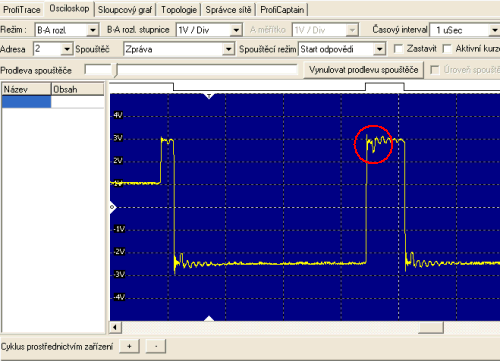 Záložka Osciloskop a opět celkem častá chyba. Někde na lince je slepá odbočka, typicky smotaný kus PROFIBUS kabelu v rozvaděči pro programátora s jedním koncem připojeným přes konektor na Slave stanici. To je ten propad dole v kroužku.