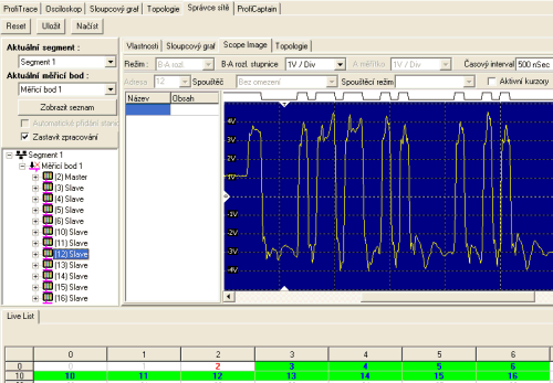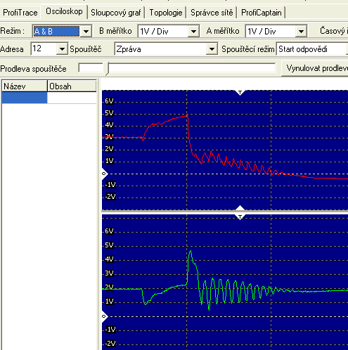 Záložka Osciloskop a jedna z běžných závad. Na poslední stanici s adresou 12 je vadný nebo není zapnutý zakončovací odpor sítě. Signalizuje nám to ten pomalý náběh tvaru zákmitů.