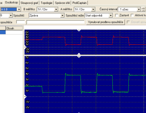 Na závěr ukázka, že vše není vždy jednoduché. Průběhy, které jste doposud mohli vidět, a jsou i na videoukázkách, pocházejí z PROFIBUS sítě 1,5 Mbps. Tenhle je ovšem ze sítě 12 Mbps. Při těchto rychlostech má průběh signálu do ideálu opravdu hodně daleko, a jeho vyhodnocení je zase o něco komplikovanější.