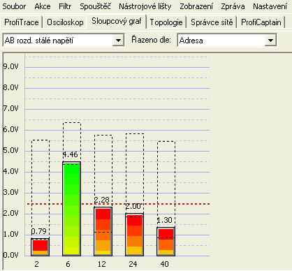 Záložka Sloupcový graf, zde je vidět, že zkrat na sběrnici už je neudržitelný, pokles napětí na jednotlivých Slave i Masterovi je velký. Stanice 6 je Wago, na kterém přes cca 10m PROFIBUS kabel zkrat vznikl.