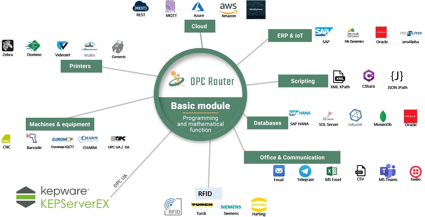 Recoja datos, conecte sistemas, calcule, compare e introduzca automáticamente los resultados en bases de datos. OPC Router le permite comunicarse con sistemas PLC, servidores OPC, impresoras, lectores RFID, correos electrónicos, hojas de cálculo de Excel, bases de datos, servicios en la nube, brokers MQTT o sistemas ERP como SAP R/3 y SAP HANA.