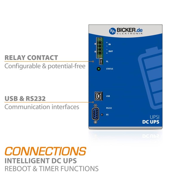 El software “UPScom” (descarga gratuita) permite el apagado controlado y la desconexión de dispositivos conectados durante un fallo de energía para prevenir la pérdida de datos o daños. La interfaz de usuario basada en la web (WEB UI) se abre en un navegador de internet y se utiliza para configurar y preprogramar todos los parámetros del sistema DC UPS, así como para el monitoreo en tiempo real con un indicador de estado de carga de la batería. Los parámetros configurables incluyen, entre otros, sensor de carga (mA), retraso de apagado, tiempo máximo de respaldo, capacidad mínima de carga antes del inicio del sistema y notificaciones por correo electrónico.