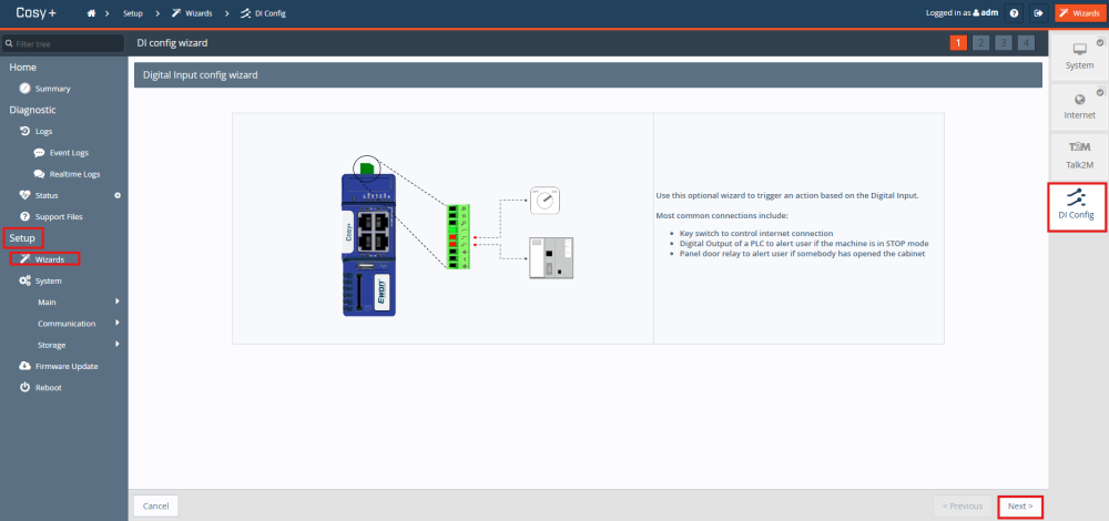 - V administraci Ewonu přejdeme do sekce DI Config (Setup – Wizards – DI Config) a klikneme na Next.