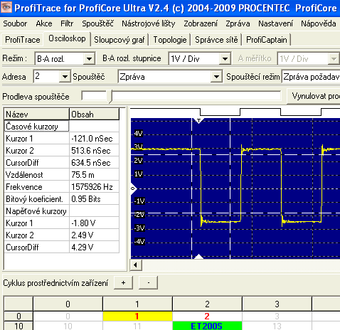 - Osciloskop – zobrazí průběh signálu na jednotlivých stanicích. Pomocí kurzorů lze přesně měřit napětí i časové parametry.