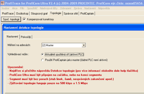 Záložka Topologie, než ovšem uvidíte obrázek topologického zapojení vaší sítě, věnujte pozornost červeným řádkům. Ne vždy se totiž topologie spočítá dobře, hlavně z důvodů nekvalitní sítě. Praxe říká, že nekvalitních PROFIBUS sítí je dost a dost. Jestli jsme si jisti, můžeme jít na tlačítko Spoč. topologii.