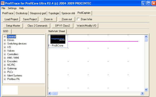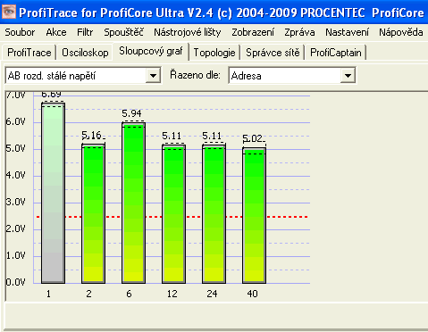 Spuštění software je v jednom okně, systémem záložek, zleva ProfiTrace – Osciloskop – Sloupcový graf – Topologie – Správce sítě – ProfiCaptain, je umožněn rychlý přístup k jednotlivým důležitým funkcím programu.