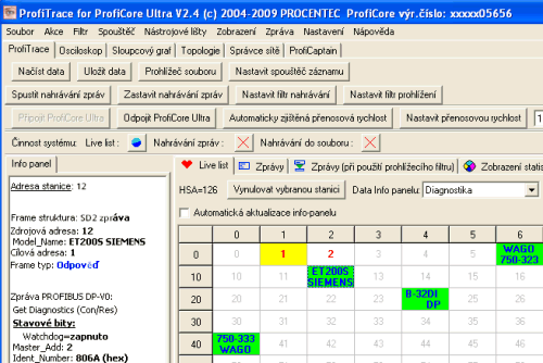 - Live list (ProfiTrace) – neustálý přehled aktivních účastníků sběrnice, včetně adres a stavů.
