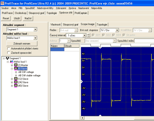 Záložka Osciloskop, opět velmi důležitá. Tady zobrazíme průběh signálu na jednotlivých stanicích. Můžeme totiž vidět signál nejen na Masteru, ale i na vybrané periferii, čímž zobrazíme jak signál postupuje, kde se kazí atp. Spouštět (synchronizovat) zprávy můžeme od všech variant, zapnuté kurzory přesně měří časové a napěťové hodnoty signálu.