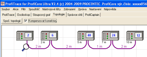- Topologie – automatický výpočet rozložení zařízení v síti. Pokud je kabeláž vadná nebo zakončení špatné, systém vás varuje.